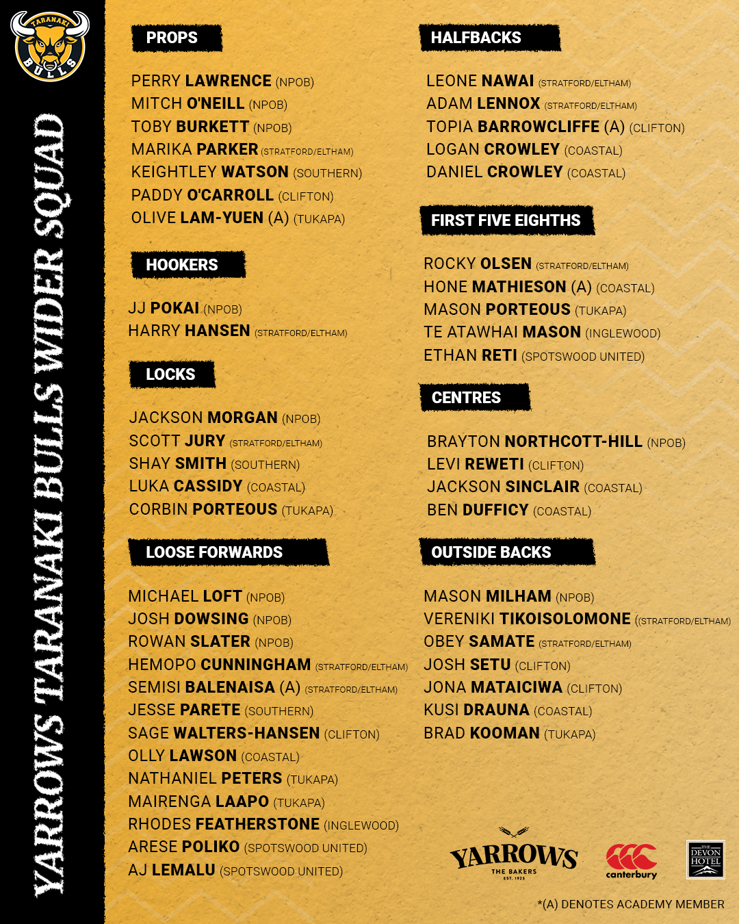 Players not making the final Yarrows Taranaki Bulls squad will have the opportunity to represent Taranaki in various other squads, including the Taranaki Māori, Taranaki Pasifika, Taranaki Trojans, and Taranaki U19s, ensuring players stay ready, should they be called upon.